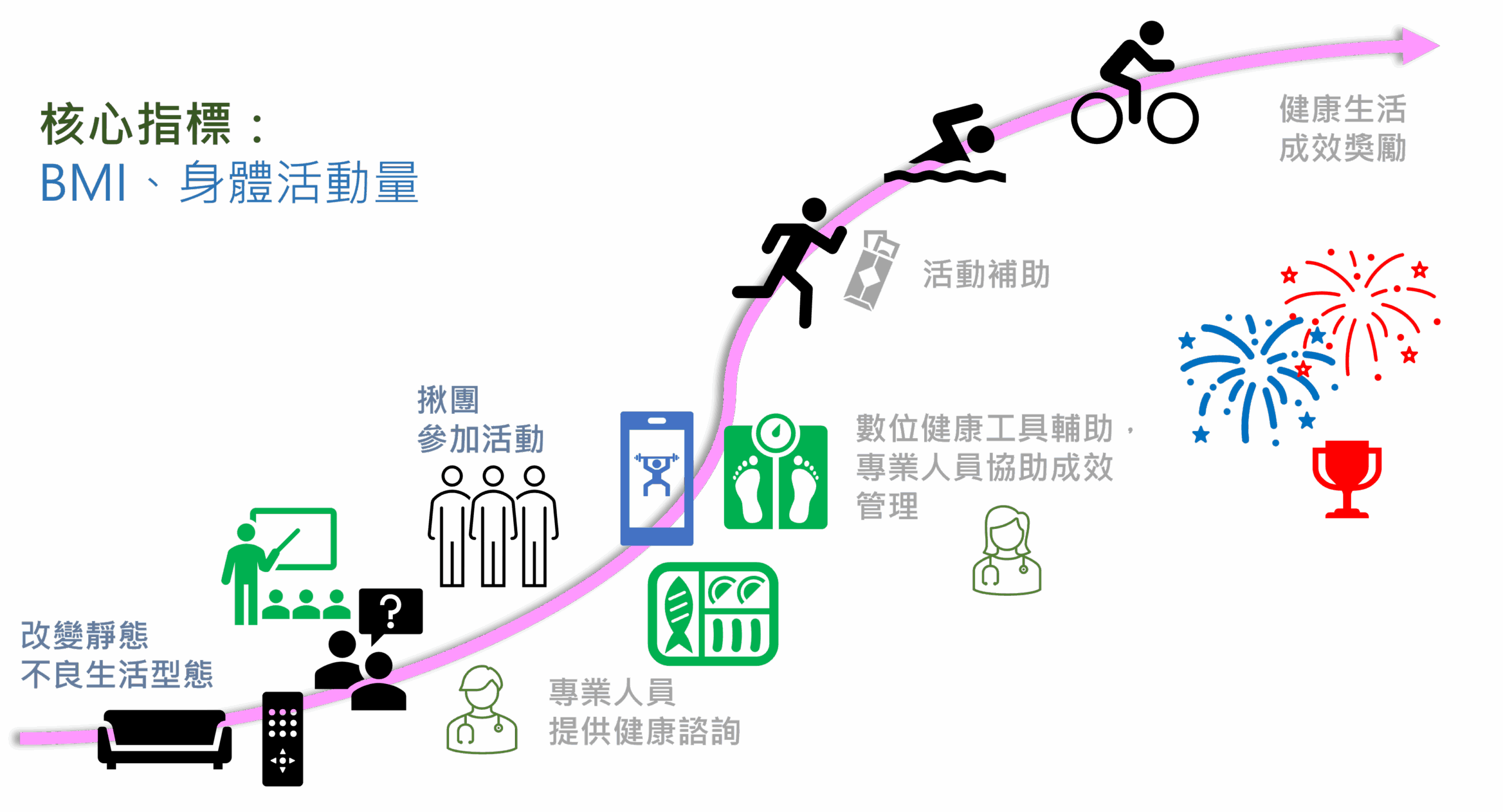 健康促進活動核心目標是鼓勵健康的生活方式與健康體態,本質不是競賽、每個人的健康目標不同,請依據個人的能力,從事合宜的安全活動。